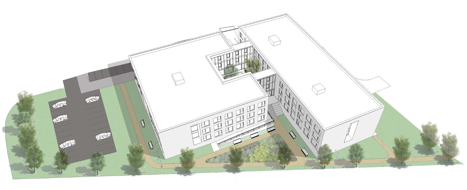 Cílem návrhu bylo vytvoření DOMOVA, který bude s respektem zasazen do okolního parkového prostředí. Výškové měřítko budovy bylo zvoleno tak, aby nekonkurovalo okolní zeleni. Jednotlivé členění hmot vytváří vlastní uzavřené prostředí s pobytovým otevřeným atriem pro bezpečný pohyb klientů. Hmoty jsou členěny zářezy zvýrazňující jednotlivé vstupy a průhledy do společných prostor s využitím odlišného principu fasády pro co největší přehlednost objektu i celkové urbanistické návaznosti na okolí.